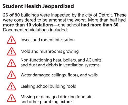 At the same time, coalitions and teachers have brought to light the deplorable conditions in which children are expected to learn. Schools are falling apart. Following building inspections by the city of Detroit, a consent agreement was put in place in mid-February of 2016 to make the necessary safety improvements and repairs. Many other school districts around the state are struggling as well, and are or will soon be facing similar deterioration, putting more kids in jeopardy.