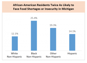 - African-American and Latinx families are more likely to face food shortages. Approximately 14% of Michiganders live in households that do not have consistent, secure supplies of food. African-American residents, who are much more likely to live in high-poverty neighborhoods with few sources of healthy foods, are twice as likely to face food shortages.
