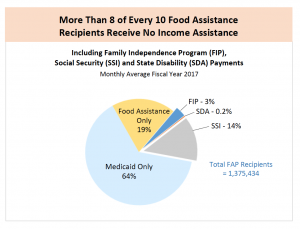 - Many Michiganians need food assistance to avoid hunger. In the 2017 budget year, 1.4 million Michigan residents used food assistance to ensure basic nutrition, including approximately 1 in 4 of the state’s children. Food assistance benefits respond well to economic downturns by providing a needed safety net.