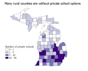 Meanwhile, private schools are not available to everyone. In Michigan, most private schools are in the more urban counties in the southern part of the state. Smaller student populations in rural districts make school competition unsustainable and many rural counties in Michigan, including in the Alpena area, have little to no private school options. Public schools in low-income and rural areas have a lot to lose in funding but little to gain.